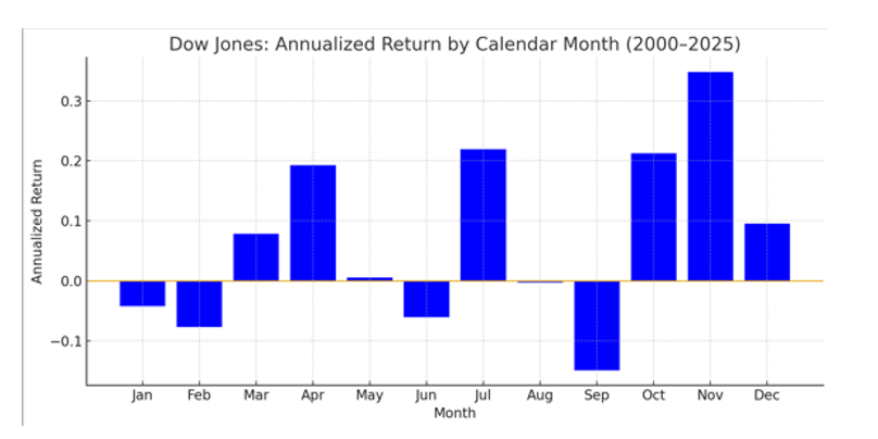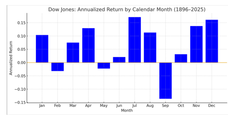 If we look at the longest available sample of US index returns (the Dow Jones Industrial Index) from 1896 to 2025, we find this distribution of annualized returns by month. (Source: Barchart)
